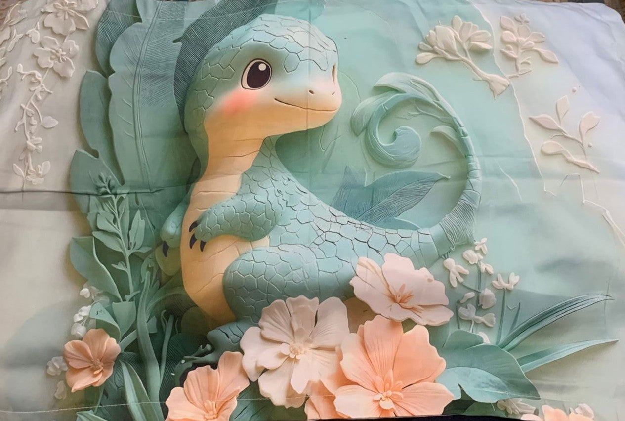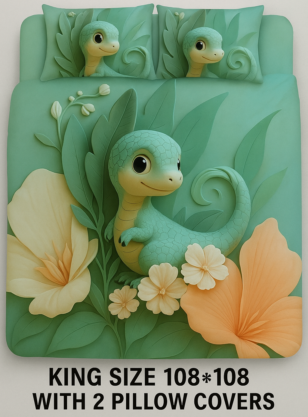 Transform your bedroom with this charming 7D printed king size bedsheet set, featuring an adorable baby dinosaur surrounded by soft pastel flowers and lush green leaves. The high-definition 7D print gives a realistic, embossed look that adds depth and elegance to your bedding. Material: Premium quality soft fabric for ultimate comfort Print Type: 7D High-Definition Digital Print Design: Cute turquoise dinosaur with floral and leaf detailing Finish: Smooth texture with long-lasting color vibrancy Set Includes: 1 King Size Bedsheet (108 x 108 inches) & 2 Matching Pillow Covers.